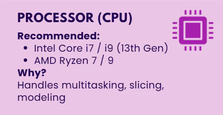 Untuk sebagian besar tugas pencetakan 3D, prosesor multi-threaded terbaru seperti Intel Core i7 dan Intel Core i9 sudah cukup. AMD Ryzen 7 atau AMD Ryzen 9 menyediakan daya komputasi yang memadai untuk menjaga kelancaran alur kerja dan respons yang instan.