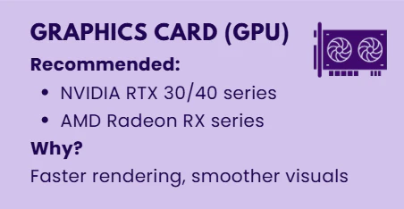 CPU yang bagus dapat menginterpretasikan banyak model 3D secara visual, tetapi proses ini sebagian besar bergantung pada GPU. Model yang kompleks dan desain yang rumit lebih cocok ditangani oleh GPU khusus. graphic cards. Membantu mempercepat proses rendering dan meningkatkan kualitas visual. Produk seperti seri NVIDIA GeForce RTX atau seri AMD Radeon RX sangat cocok, dan Anda tidak akan menyesal menggunakannya.